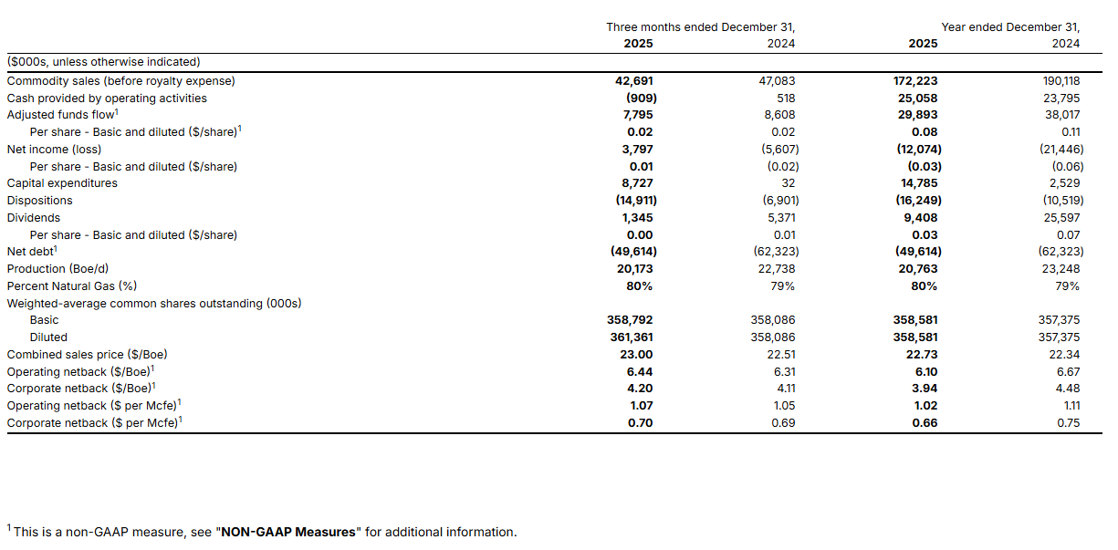 This news release uses the terms "adjusted funds flow", "operating netbacks", "corporate netbacks" and "net debt" which are not recognized under International Financial Reporting Standards ("IFRS") and may not be comparable to similar measures presented by other companies. These measures should not be considered as an alternative to, or more meaningful than, IFRS measures including net earnings, cash provided by operating activities, or total liabilities. The Company uses these measures to evaluate its performance, leverage and liquidity. Adjusted funds flow is a non-Generally Accepted Accounting Principles ("non-GAAP") measure that represents the total of funds provided by operating activities, before adjusting for changes in non-cash working capital, and decommissioning obligations settled. Net debt is a non-GAAP measure calculated as the sum of cash, accounts receivables and prepaid expenses and deposits less demand loan, term loan, and accounts payable and accrued liabilities. Operating netback and operating netback per Boe and per Mcfe are calculated as the sum of commodity sales, processing and gathering income and realized gain (loss) on risk management contracts, less royalties, transportation and operating expenses on an absolute and a per Boe or per Mcfe basis, respectively. Corporate netback on an absolute dollar and corporate netback per Boe and per Mcfe are calculated as operating netback less general and administrative and interest expense. Please refer to the 2025 annual management's discussion and analysis for additional details regarding non-GAAP measures and their calculations.